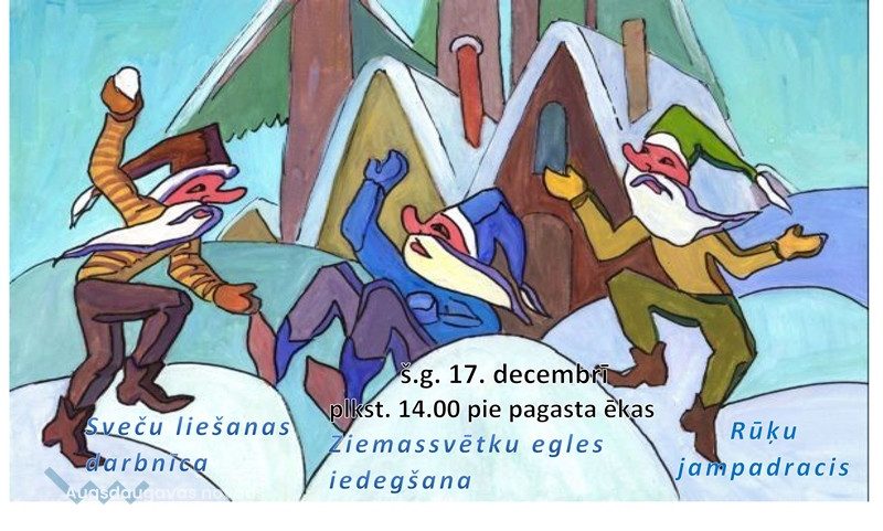 No plkst. 15.00-16.00 "Rūķu Krustmāte" aicinās Rūķus iedegt Ziemassvētku egli. ...un tad sākas Rūķu jampadracis: pazudušo rūķu un gaismas meklēšana, dziedāšana ,dejošana, rotaļās iešana. Mielošanās ar saimnieces piparkūkām un ,,raganu” tējas malkošanu un pārsteigums (pie pagasta ēkas).