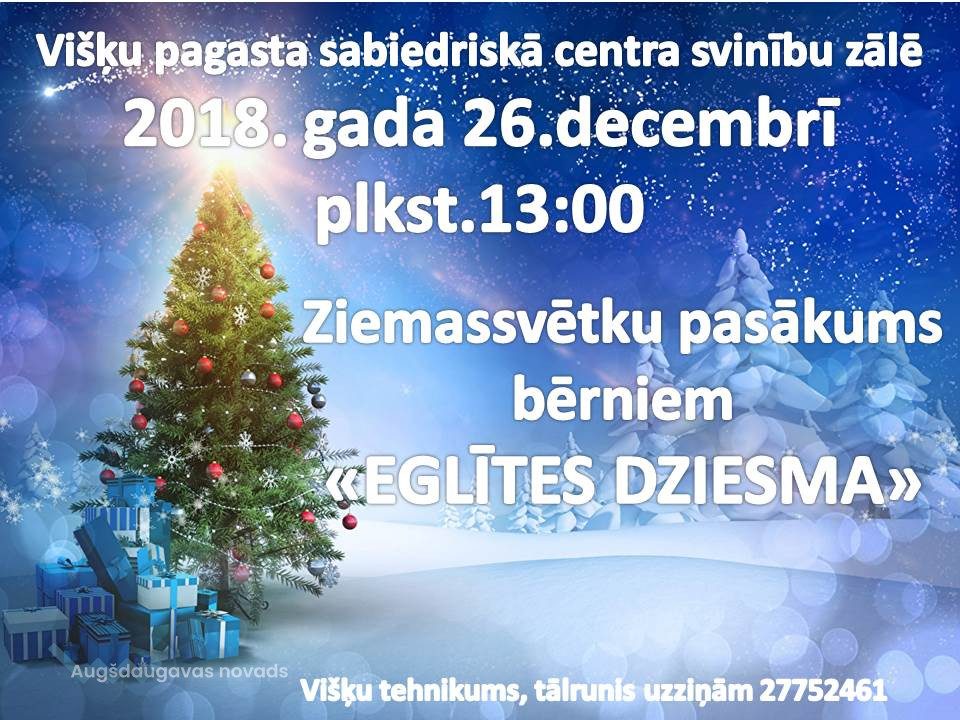 Ziemassvētku eglīte bērniem Višķos19.12.2018AKTUĀLI 26. decembrī plkst. 13.00 visus Višķu pagasta bērnus un ciemiņus aicinām uz Ziemassvētku pasākumu bērniem "Eglītes dziesma", kas notiks Višķu pagasta Sabiedriskā centra svinību zālē.Pavadīsim šos svētkus kopā!