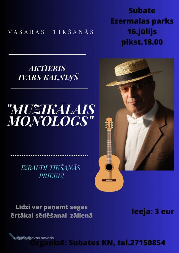 Aktiera Ivara Kalniņa koncerttikšanās16.07.2023Kultūra Vieta: Subatē Ezermalas parkāLaiks:18:00Datums:16.07.2023