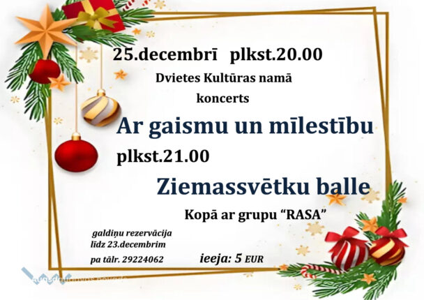 Balle Dvietē, spēlē “Rasa”25.12.2024Kultūra Biļetes cena 5 eiroVieta: Dvietes pagasta kultūras namsLaiks:21:00Datums:25.12.2024
