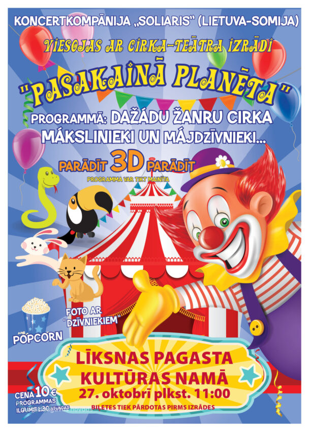 Cirka izrāde “Pasakainā planēta” Līksnā27.10.2024Kultūra Vieta: Līksnas pagasta kultūras namsLaiks:11:00Datums:27.10.2024