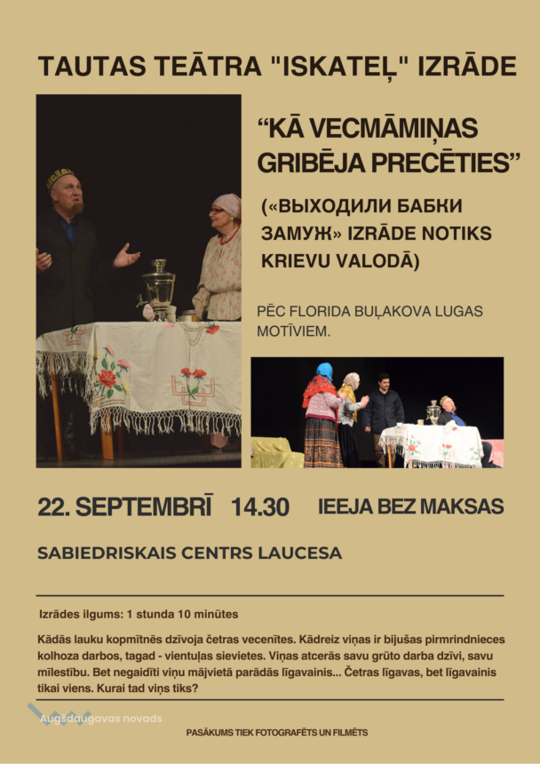 Daugavpils Tautas teātra izrāde Laucesā22.09.2024Kultūra 22. septembrī 14.30 Sabiedriskajā centrā “Laucesa” notiks Daugavpils Tautas teātra “Iskateļ” izrāde “Kā vecmāmiņas gribēja precēties”. Ieeja bez maksas.Vieta: Sabiedriskais centrs “Laucesa”Laiks:14:30Datums:22.09.2024