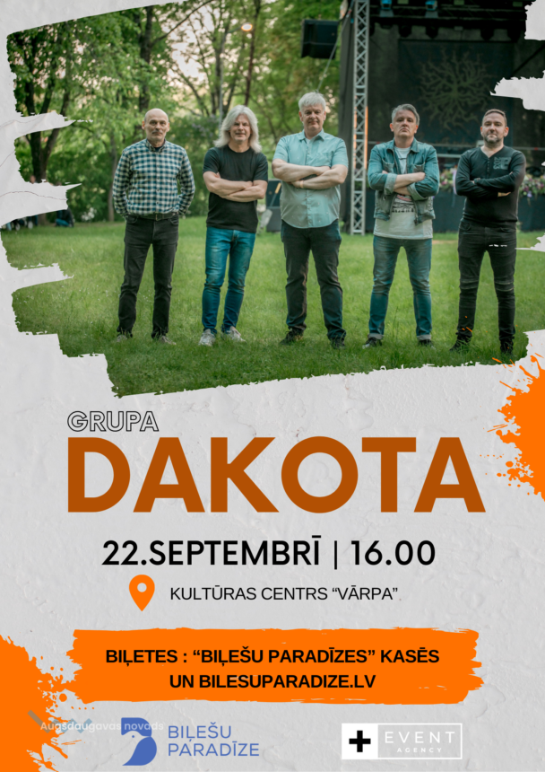 Grupas “Dakota” koncerts22.09.2024Kultūra Vieta: Augšdaugavas novada kultūras centrs "Vārpa"Laiks:16:00Datums:22.09.2024