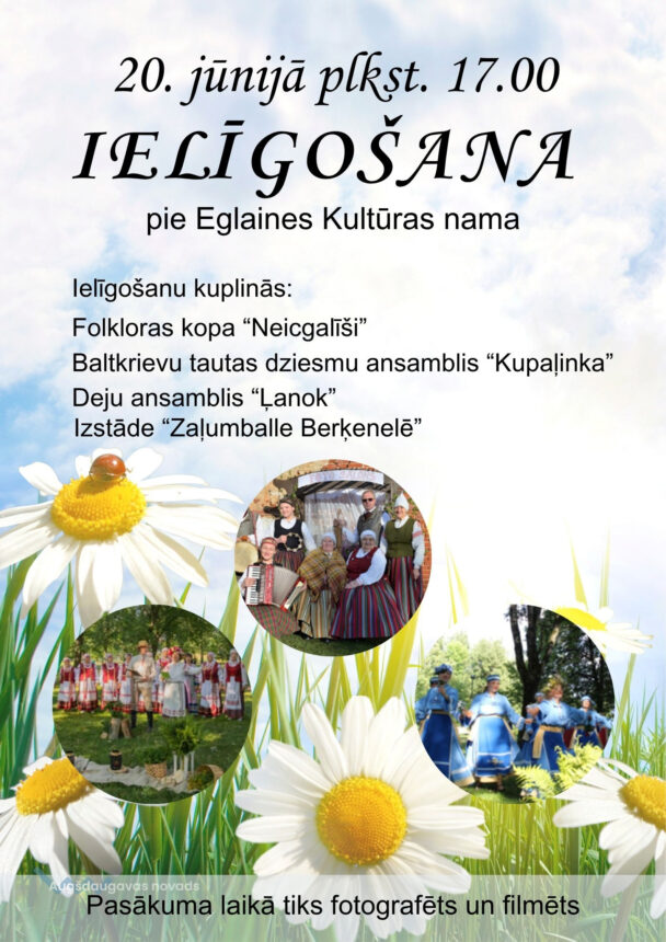 20.jūnijā 17.00 pie Eglaines Kultūras nama Ielīgošana kopā ar Nīcgales pagasta Tautas nama folkloras kopu “Neicgalīši”.