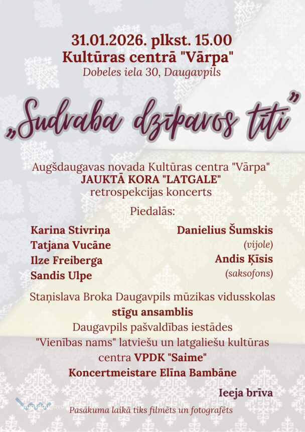 Jauktā kora “Latgale” koncerts31.01.2026Kultūra Vieta: Augšdaugavas novada kultūras centrs "Vārpa"Laiks:15:00Datums:31.01.2026