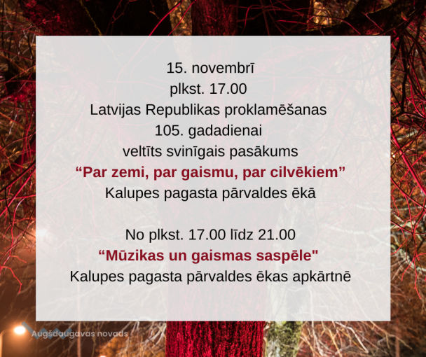 “Mūzikas un gaismas saspēli” Kalupes pagasta pārvaldes ēkas apkārtnē no plkst. 17.00 līdz 21.00 piedāvās IK “Inteligent”.