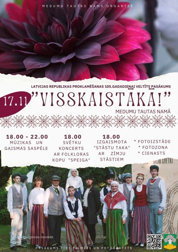 Svinīgs pasākums “Visskaistākā!”17.11.2023Kultūra Valsts svētku pasākumi MedumosVieta: Medumu pagasta tautas namsLaiks:18:00Datums:17.11.2023