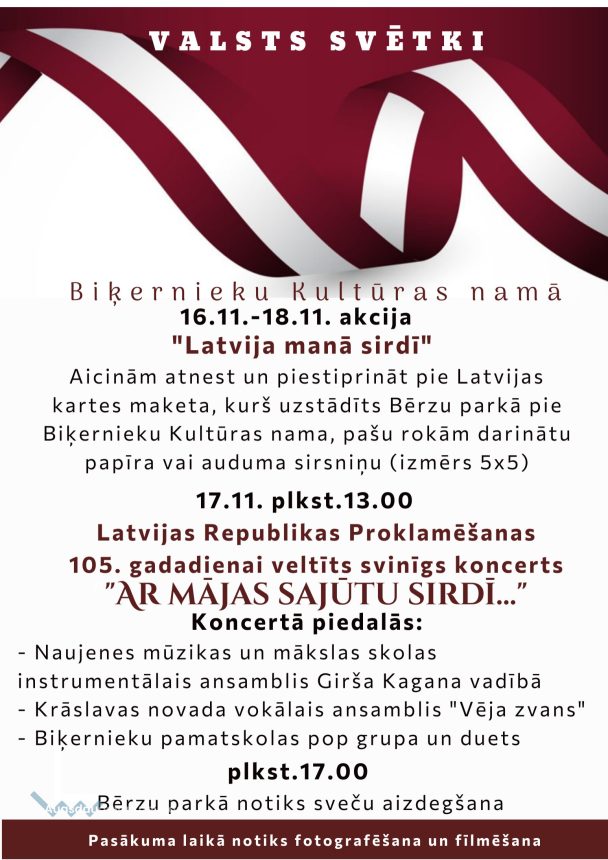 Svinīgs koncerts “Ar mājas sajūtu sirdī…”17.11.2023Kultūra Koncertā piedalīsies Biķernieku pamatskolas audzēkņi, Naujenes mūzikas un mākslas skolas instrumentālais ansamblis un Krāslavas novada vokālais ansamblis “Vēja zvans”.Vieta: Biķernieku pagasta kultūras namsLaiks:13:00Datums:17.11.2023