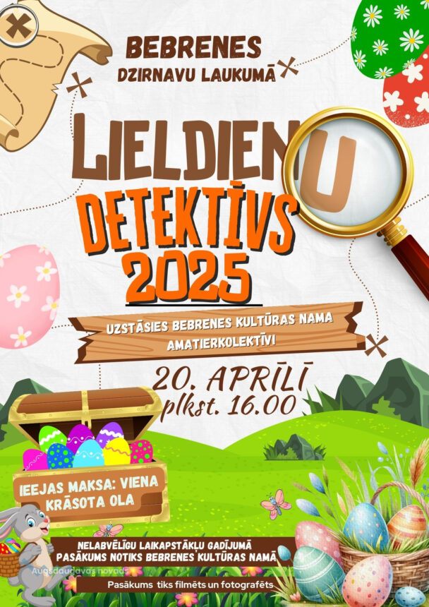 Lieldienu koncerts Bebrenē “Lieldienu detektīvs!’’20.04.2025Kultūra Vieta: Bebrenes pagasta kultūras namsLaiks:16:00Datums:20.04.2025