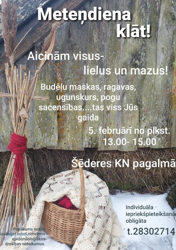 Pasākums visiem, kas vēlas izzināt mūsu tautas tradīcijas. KN teritorijā tiks izvietoti vides objekti Meteņu tematikā. Aktivitātes: pogu mešana grozā, bildēšanās īstās zirgu ragavās ar Meteņdienas budēļiem. Ir iespēja arī pašiem piedalīties, atnesot adītu, rakstainu cimdu, kopīgi rotāsim upes krasta žodziņu. Individuāla pieteikšanās.