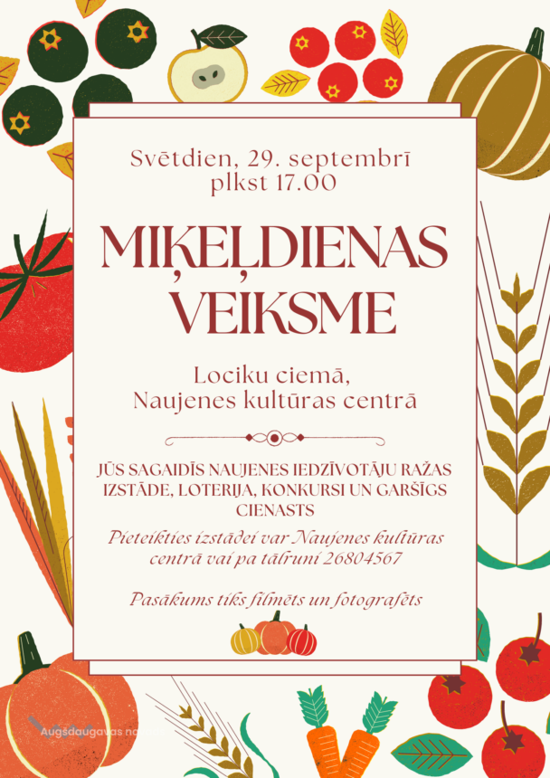29. septembrī 17.00 Naujenes Kultūras centrā notiks Miķeļdienas svinības – ražas izstāde, degustācija un citas aktivitātes.