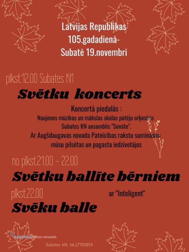 Valsts svētku svinības Subatē19.11.2023Kultūra Vieta: Subates Kultūras namsLaiks:12:00Datums:19.11.2023