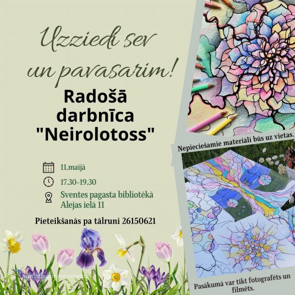 Neirolotosa meistarklase “Uzplauksti sev un pavasarim”11.05.2023Kultūra Vieta: Sventes pagasta bibliotēkaLaiks:17:30Datums:11.05.2023