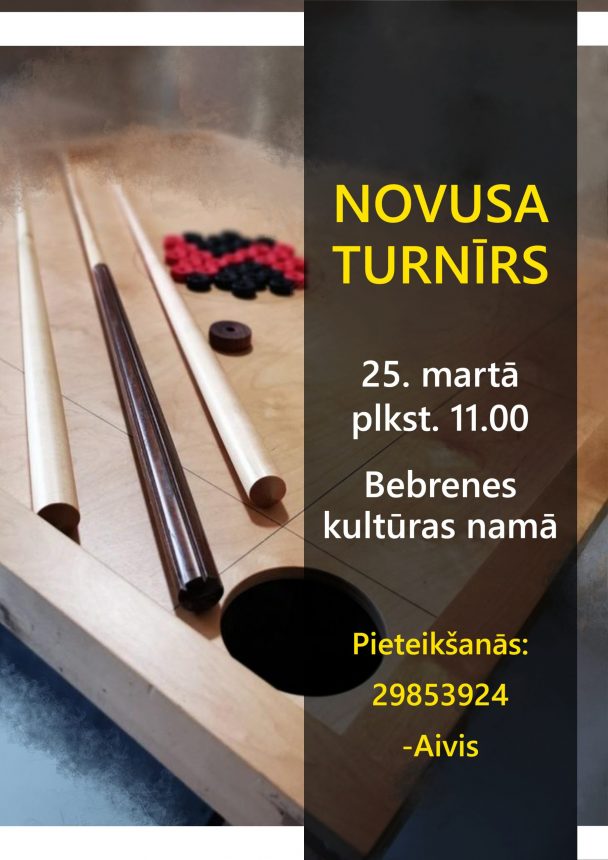 Novusa turnīrs25.03.2023Kultūra Vieta: Bebrenes pagasta kultūras namsAtbildīgais:Aivis, tālr.: 29853924Laiks:11:00Datums:25.03.2023