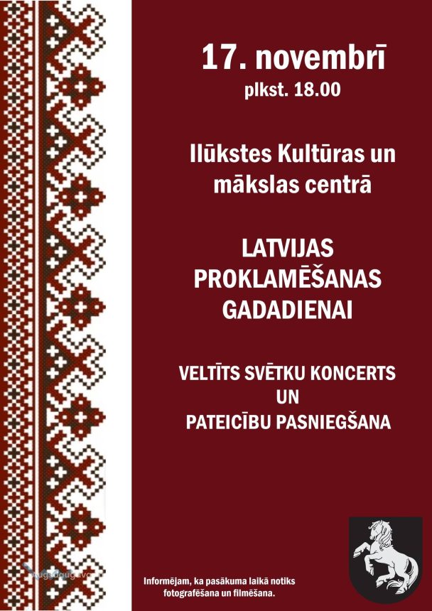 Koncerts un pateicību pasniegšana17.11.2023Kultūra Vieta: Ilūkstes kultūras un mākslas centrsLaiks:18:00Datums:17.11.2023