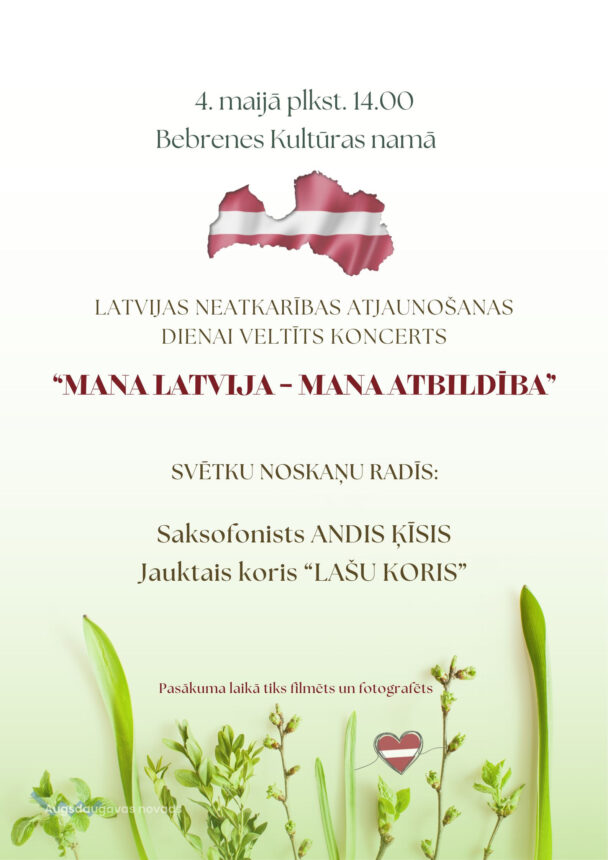 4. maijā 14.00 Latvijas Republikas Neatkarības atjaunošanas dienas pasākums “Mana Latvija – Mana atbildība” Bebrenes Kultūras namā.