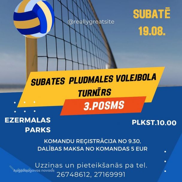 Pludmales volejbola turnīrs19.08.2023Jaunatne Vieta: Subates ezermalas parksLaiks:10:00Datums:19.08.2023