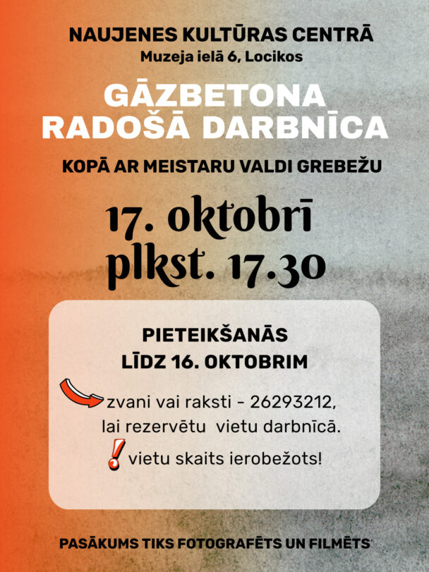 Radošā darbnīca ar meistaru Valdi Grebežu17.10.2025Kultūra Vieta: Naujenes kultūras centrsLaiks:17:30Datums:17.10.2025