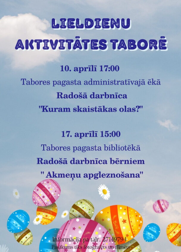 Radošā darbnīca “Kuram skaistākas olas?”10.04.2025Kultūra Vieta: Tabores pagasta pārvaldeLaiks:17:00Datums:10.04.2025