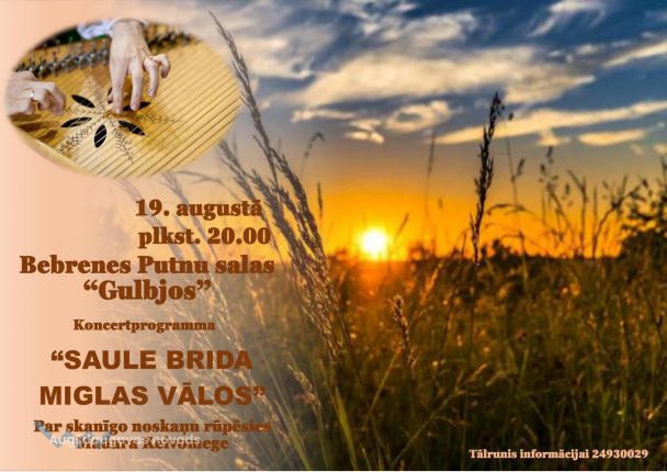 Saule brida miglas vārtos19.08.2023Kultūra Vieta: Bebrenes Putnu salas ‘’Gulbjos’’Laiks:20:00Datums:19.08.2023