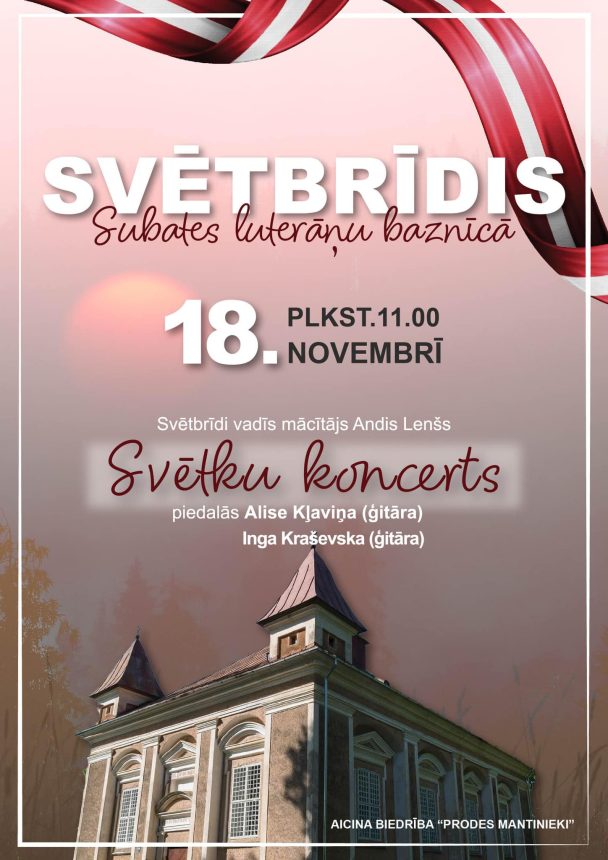 Svētbrīdis un svētku koncerts Subates luterāņu baznīcā18.11.2023Kultūra Vieta: Subates luterāņu baznīcaLaiks:11:00Datums:18.11.2023