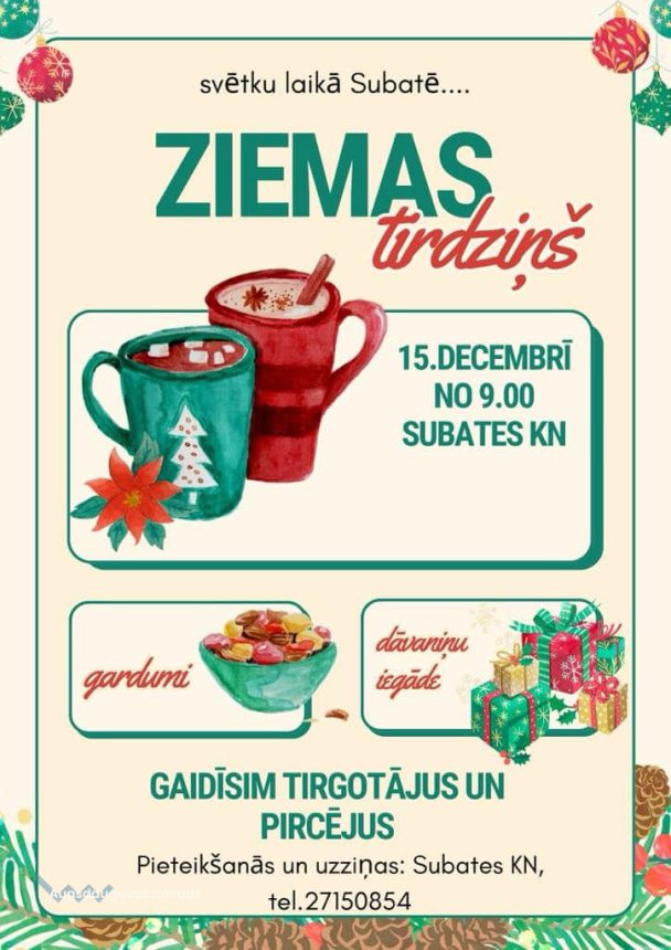 Tradicionālais Ziemas tirdziņš15.12.2023Kultūra Vieta: Subates Kultūras namsLaiks:09:00Datums:15.12.2023