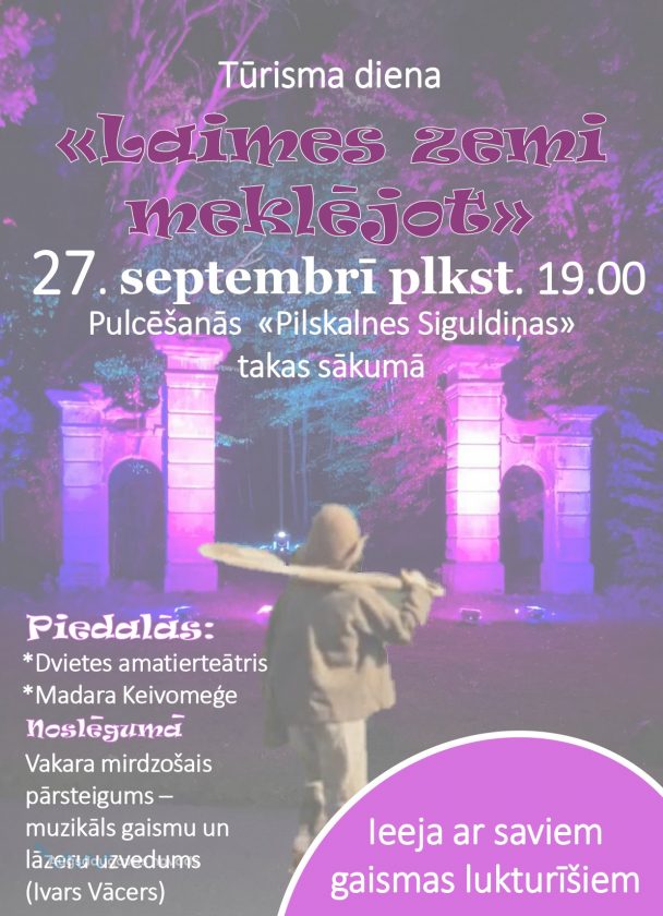 Tūrisma diena “Laimes zemi meklējot”27.09.2023Tūrisms Vieta: Pilskalnes SiguldiņaLaiks:19:00Datums:27.09.2023