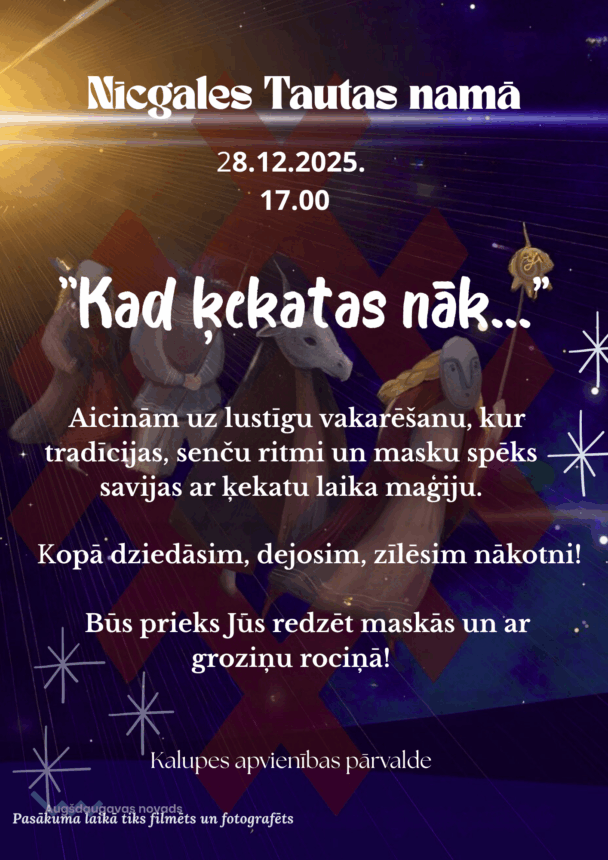 Vakarēšana “Kad ķekatas nāk”28.12.2025Kultūra Vieta: Nīcgales tautas namsLaiks:17:00Datums:28.12.2025