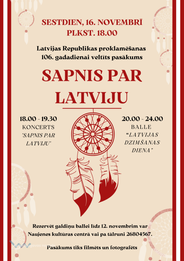 Valsts svētku koncerts “Sapnis par Latviju”16.11.2024Kultūra 16. novembrī 18.00 Naujenes Kultūras centrā Latvijas Republikas proklamēšanas 106. gadadienai veltīts pasākums “Sapnis par Latviju” divās daļās – koncerts un svinības.Lai nodrošinātu vietu, nepieciešama galdiņu rezervācija, tālr. 26804567 (Santa)Vieta: Naujenes kultūras centrsLaiks:18:00Datums:16.11.2024