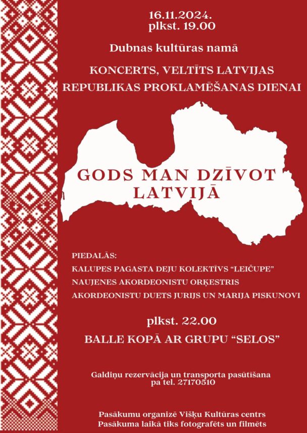 16. novembrī 19.00 Dubnas Kultūras namā Latvijas Republikas proklamēšanas 106. gadadienai veltīts pasākums “Gods man dzīvot Latvijā”.