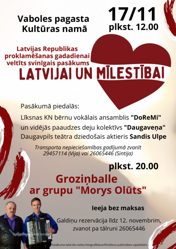 17. novembrī 12.00 Vaboles pagasta Kultūras namā Latvijas Republikas proklamēšanas gadadienai veltīts svinīgais pasākums “Latvijai un mīlestībai”. 20.00 groziņballe ar Daini un Jāni Somiem.