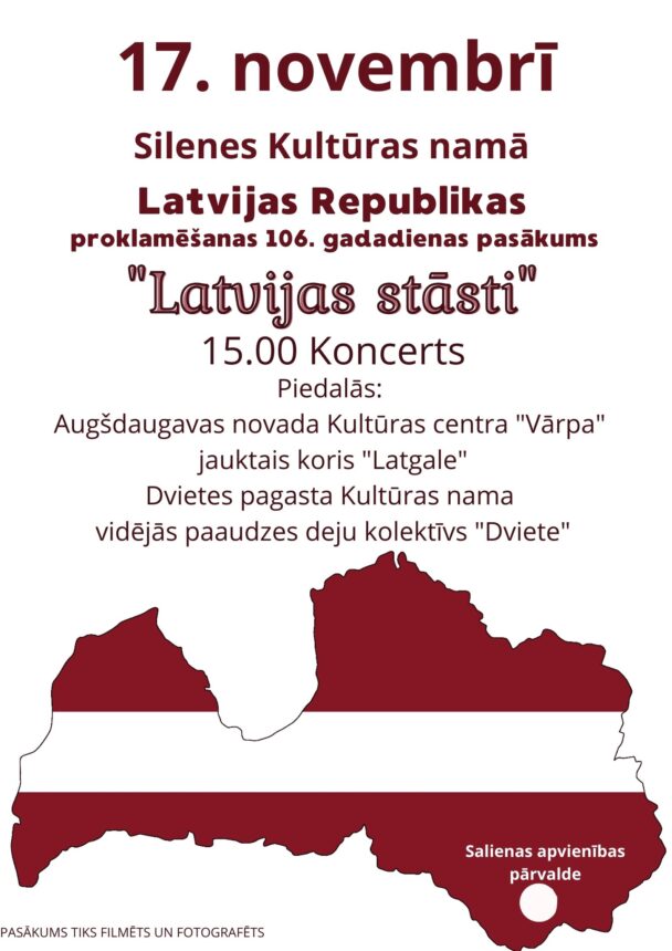Valsts svētku pasākums “Latvijas stāsti”17.11.2024Kultūra 17. novembrī Silenes Kultūras namā Latvijas Republikas proklamēšanas dienai veltīts svētku pasākums, 14.30 – radošā darbnīca “Latvija Tavās rokās”, 15.00 – svētku koncerts “Latvijas stāsti”Vieta: Silenes kultūras namsLaiks:14:30Datums:17.11.2024