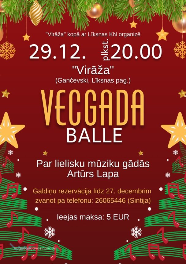 Vecgada balle29.12.2023Kultūra Vieta: Virāža, Līksnas pagastsAtbildīgais:S. Giptere t. 26065446 kultura@liksna.lvLaiks:20:00Datums:29.12.2023