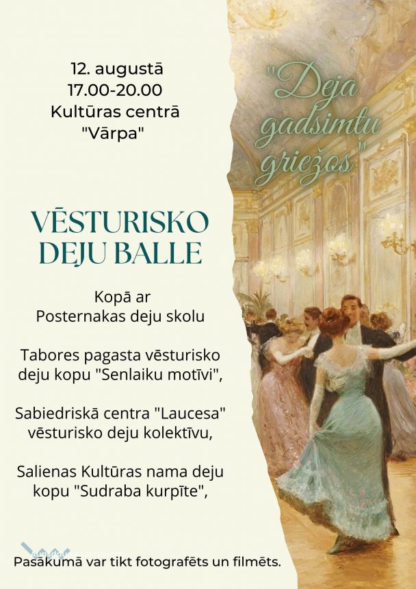 Vēsturisko deju balle12.08.2023Kultūra Vieta: Novada kultūras centrs “Vārpa”Atbildīgais:K.SaulīteLaiks:17:00Datums:12.08.2023