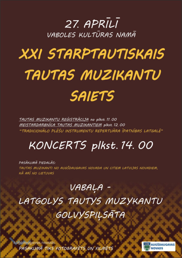XXI Tautas muzikantu saiets27.04.2025Kultūra Vieta: Vaboles Kultūras namsLaiks:11:00Datums:27.04.2025