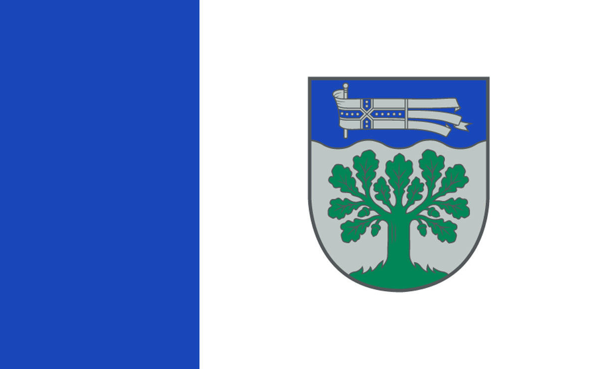 Dalīts galvā ar viļņotu griezumu: zils un sudrabs. Augšējā laukā plīvojošs sudraba karogs ar trīsdaļīgi šķeltiem galiem, apakšējā – no zaļas pamatnes izaugošs tāds pats ozols.