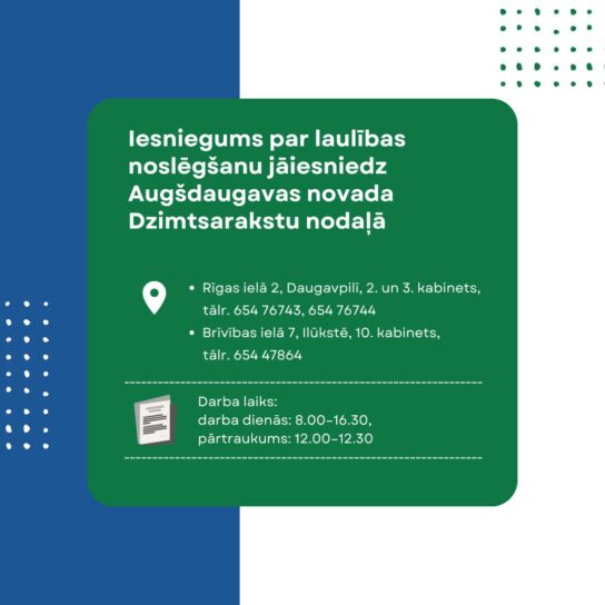 Dzimtsarakstu nodaļas telpās laulības reģistrācija bez ceremonijas, bez viesu klātbūtnes (klātesot) lieciniekiem - jebkurā darba dienā: